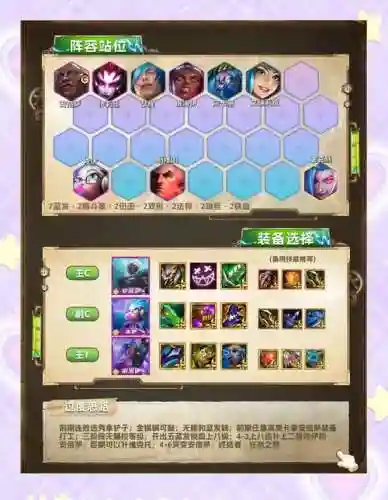 前期阵容 核心英雄:剑圣+兽王。这两个英雄的组合在前期非常强势,剑圣提供AOE伤害和生存能力,兽王则提供额外的肉盾和控制效果。搭配羁绊:可以选择搭配一个地精或精灵英雄来激活羁绊效果,增强整体战斗力。中期阵容 核心英雄:法师组合,如冰女+电魂(或帕克/蓝胖)。
